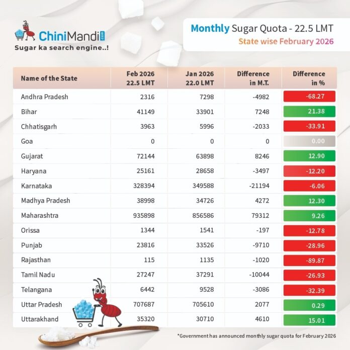 In a notification released on January 30, the Food Ministry allocated a monthly sugar quota of 22.5 lakh metric tonnes (LMT) for February 2026, which is equal to the quota allocated for February 2025.